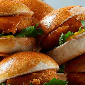 6. Abre los bollos por la mitad, caliéntalos ligeramente en un sartén y arma las sliders untando los bollos con el aderezo y sirviendo encima un nugget con queso, arógula y las salsas de tu preferencia.
