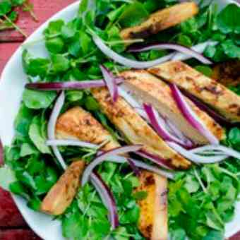 Posteriormente en un bol se colocan los berros, ya lavados y desinfectados. Se aderezan con aceite de oliva Extra Virgen Miguelle al gusto y se acompañan las pechugas con esta rica ensalada.