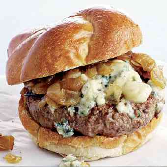 Dorar el pan con mantequilla y una vez lista la carne, montar en el pan, agregar la mitad del aderezo sobre cada carne y terminar con las cebollas caramelizadas y poner la tapa encima.
